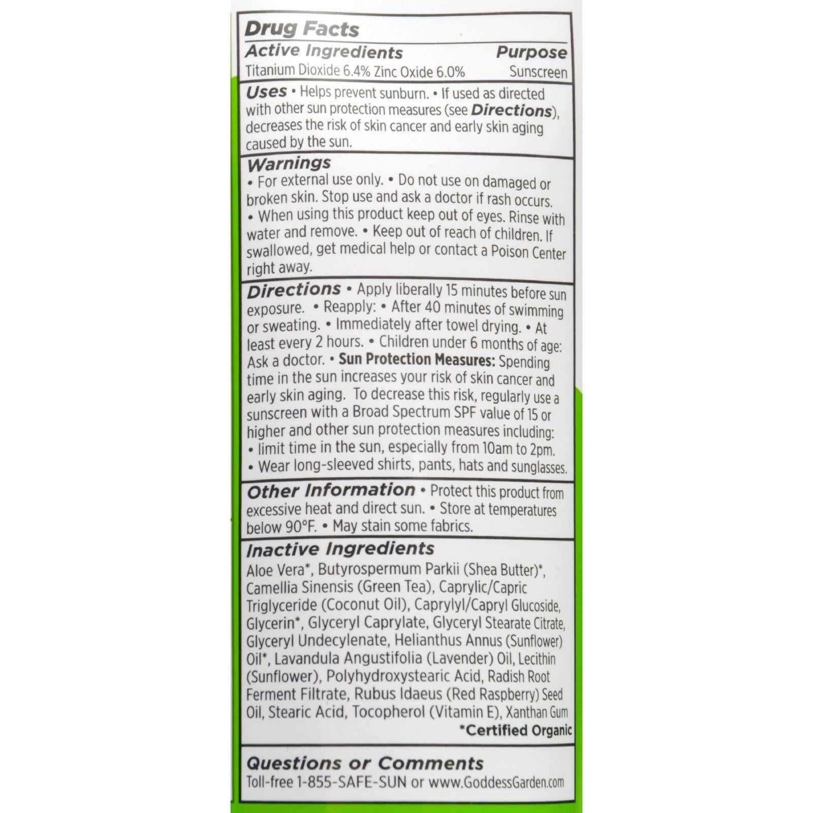 Ingredients : Active Ingredients: Zinc Oxide 6%, Titanium Dioxide 6%. Other Ingredients: Organic Aloe Barbadensis (Aloe Vera Juice), Organic Glycine Soja (Soybean) Oil, Organic Helianthus Annuus (Sunflower) Seed Oil, Caprylic Triglyceride, Lecithin, Organic Butyrospermum Parkii (Shea) Butter, Xanthan Gum, Vegetable Glycerin, Potassium Sorbate, Camellia Sinensis Leaf (Green Tea) Extract, Tocopherol (Vitamin E), Organic Lavandula Angustifolia (Lavender) Essential Oil.